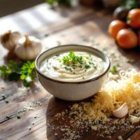 A creamy blend of garlic and parmesan cheese, typically with a hint of herbs.